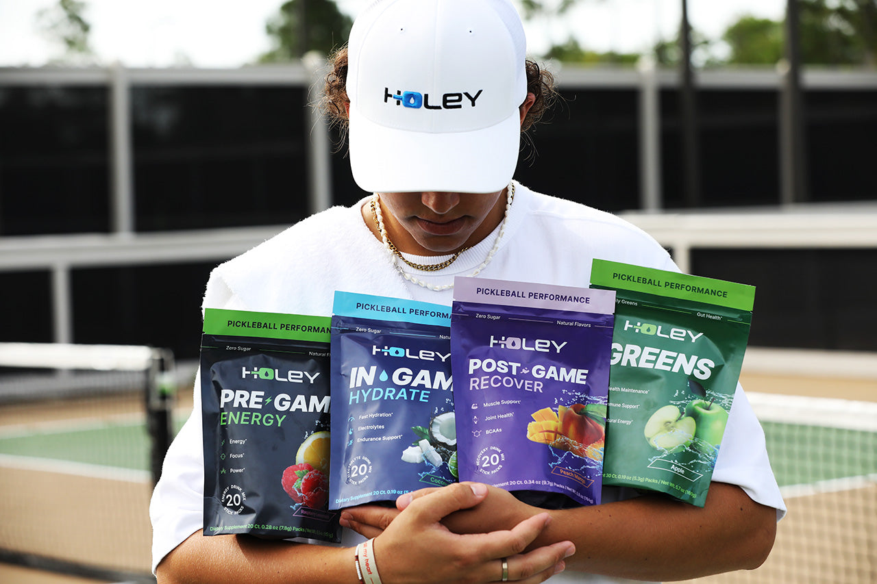 Holey is the only pickleball supplement on the market created to help players in every aspect of their game: Need help focusing on the courts? Try ENERGY. Feeling fatigued from playing all day in the sun? Our HYDRATE products are a great fit. Trying to get back to the courts more often? Add RECOVER to your recovery routine for muscle and joint support. And don’t forget about GREENS for daily health!